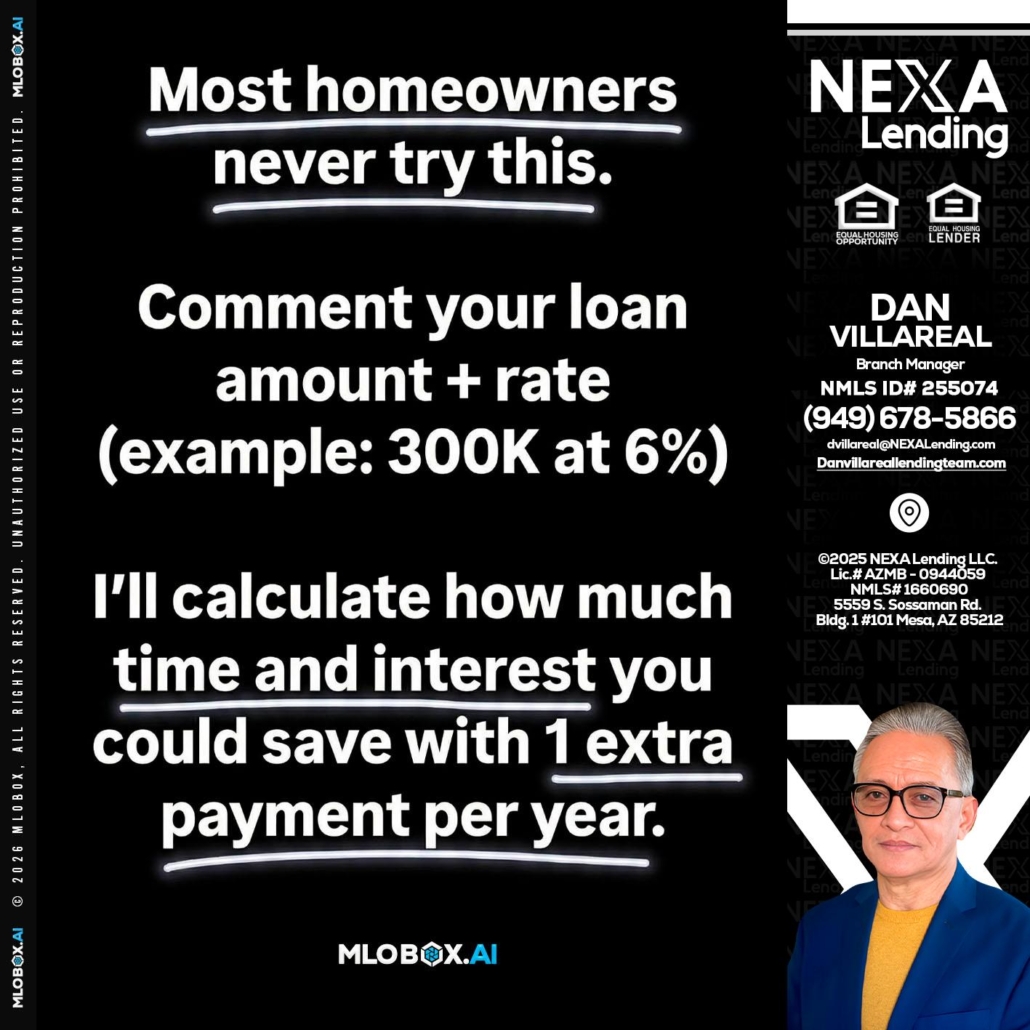 most owners - Dan Villareal -Mortgage Loan OriginatorHi, my name is Dan Villareal. I’m a Loan Officer with NEXA Lending LLC., offering personalized mortgage solutions, fast customized quotes, great rates and service with integrity.