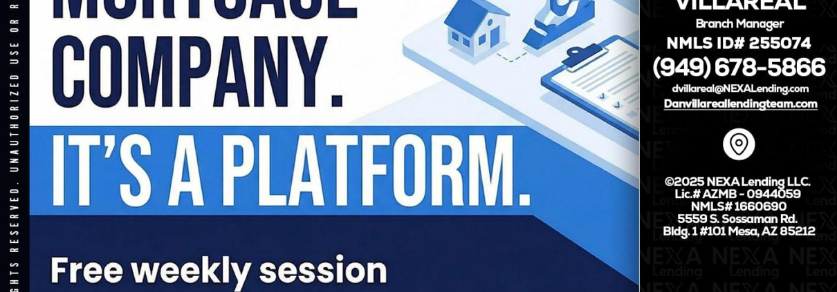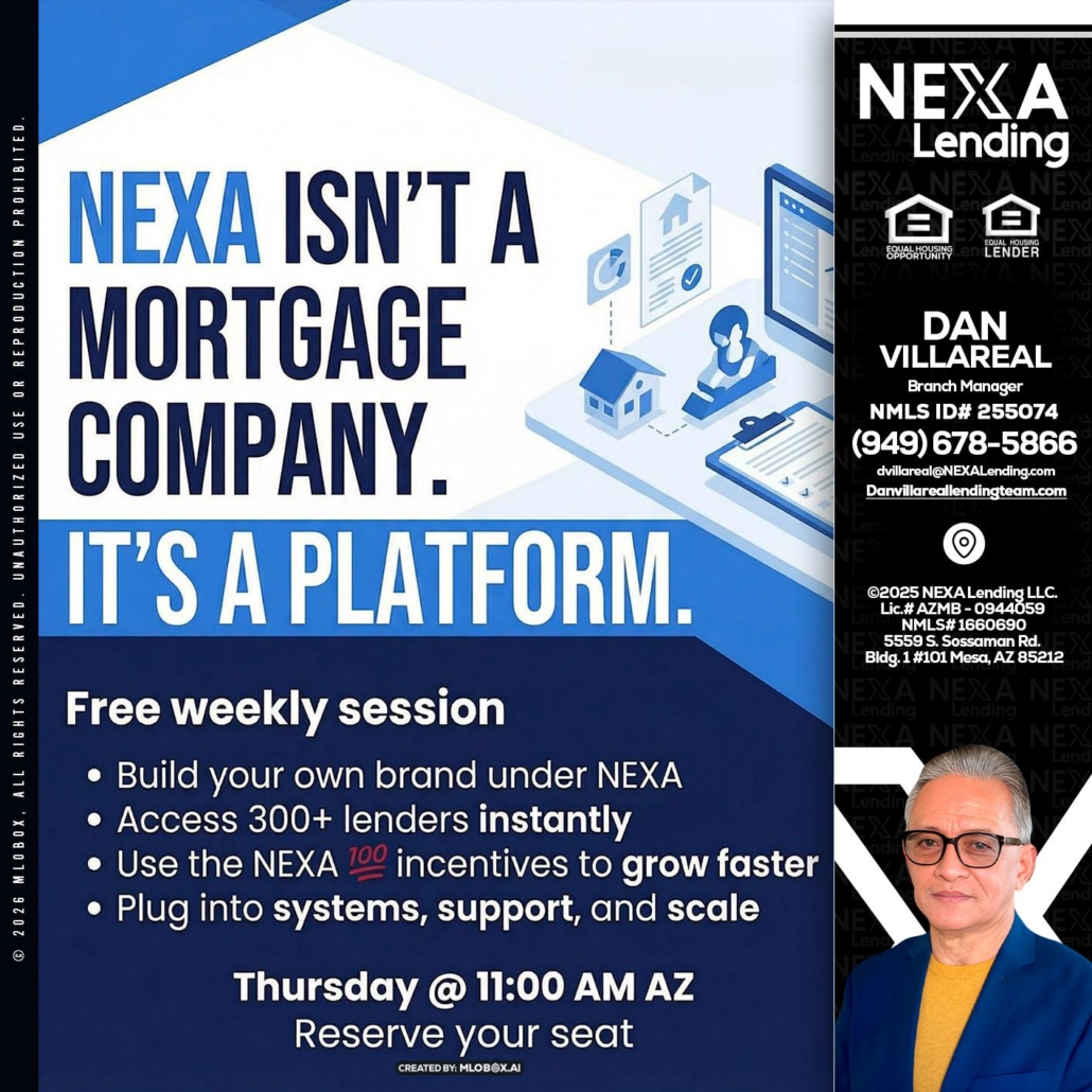 NEXA ISNT - Dan Villareal -Mortgage Loan OriginatorHi, my name is Dan Villareal. I’m a Loan Officer with NEXA Lending LLC., offering personalized mortgage solutions, fast customized quotes, great rates and service with integrity.