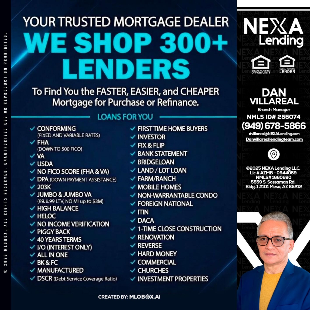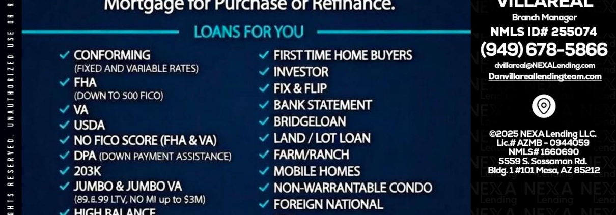Hi, my name is Dan Villareal. I’m a Loan Officer with NEXA Lending LLC., offering personalized mortgage solutions, fast customized quotes, great rates and service with integrity.