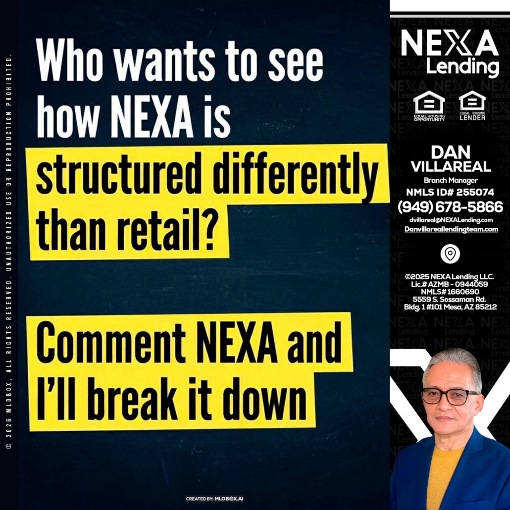 who want to see - Dan Villareal -Mortgage Loan OriginatorHi, my name is Dan Villareal. I’m a Loan Officer with NEXA Lending LLC., offering personalized mortgage solutions, fast customized quotes, great rates and service with integrity.
